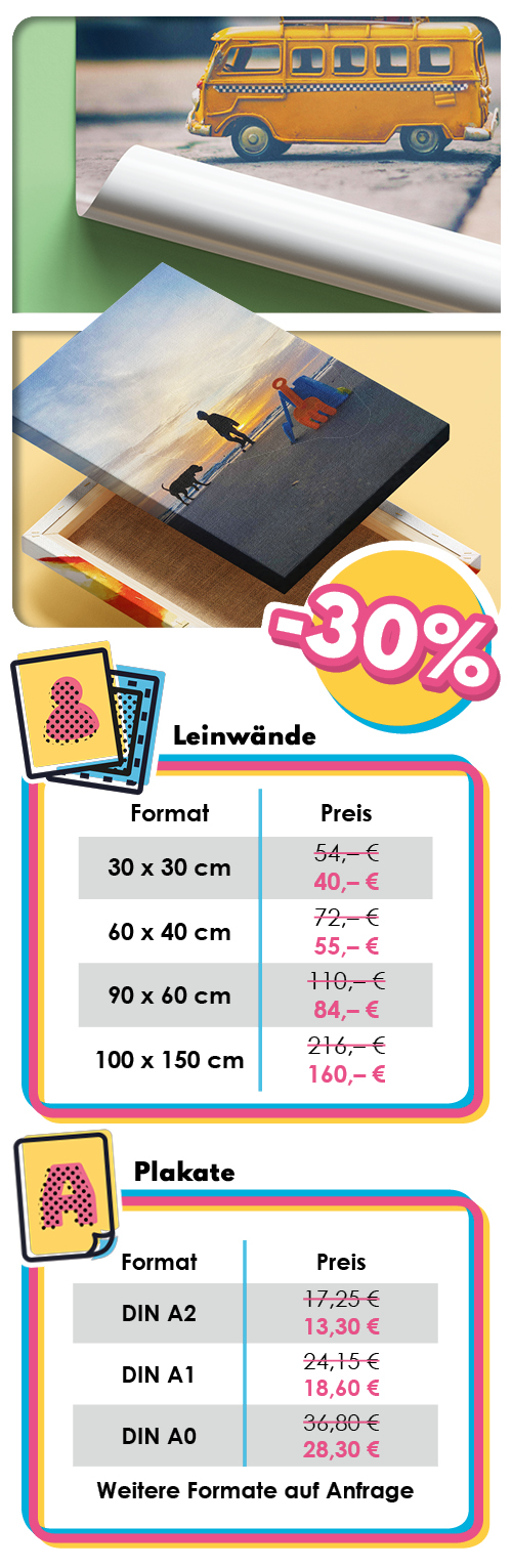 Nutzen Sie die Chance - denn bis Ende März gibt es 30% Rabatt auf Leinwände und Plakate im Großformat!